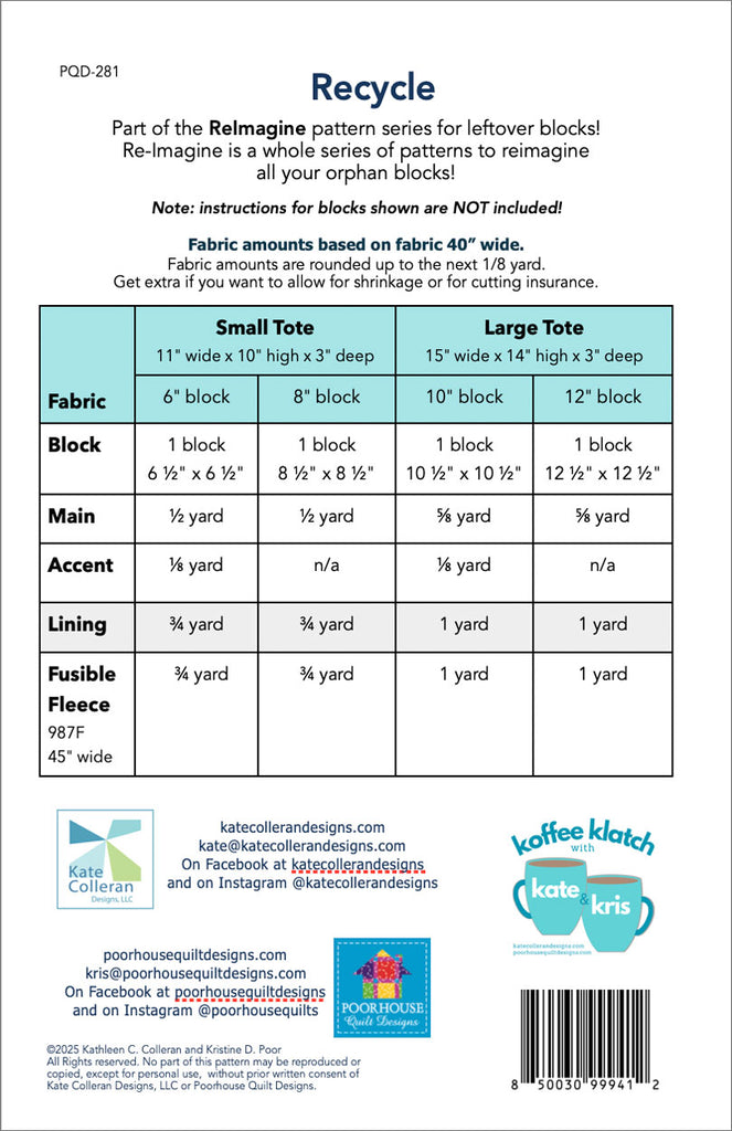 Have leftover quilt blocks? Turn them into a fun and functional ReCycle tote! Designed by Kate Colleran and Kris Poor, project turns an orphan 6 ”, 8”, 10” or 12” block into a creative tote (pattern has two sizes; tote size is dependent on block size).